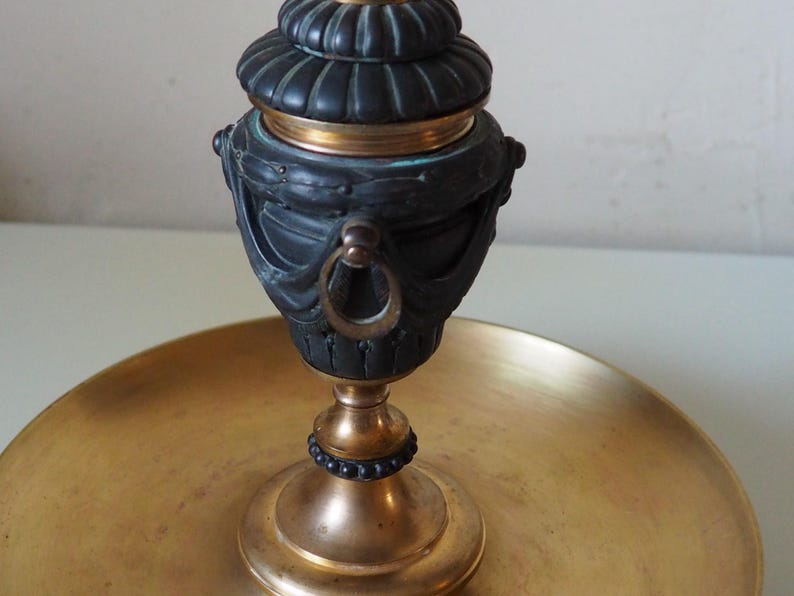 Condition is excellent considering its age there are no cracks in the vase or chips, there is a slight patina of time in places more so on the large brass drip tray to the bottom where you can see rose colours where the brass is oxidised and probably been polished a lot over time, the black urn to the centre also has some white marking on it I have not tried to remove it but it can be seen in the photos apart from that nothing that would detract from its beauty.