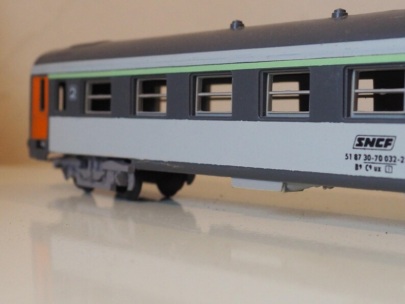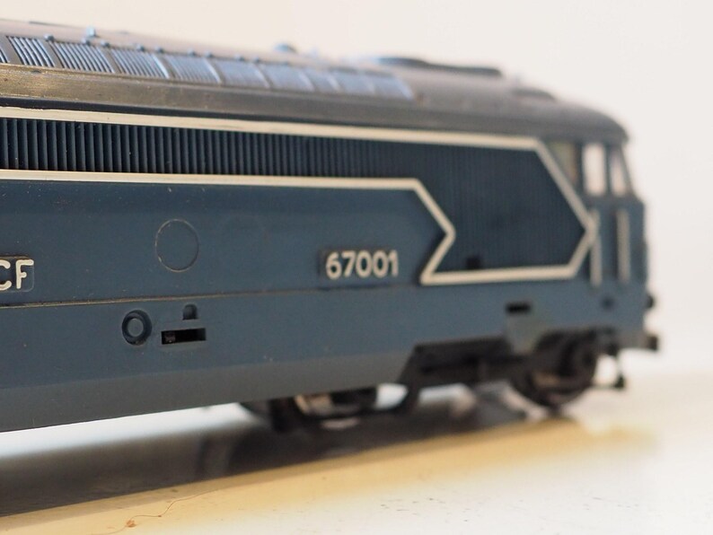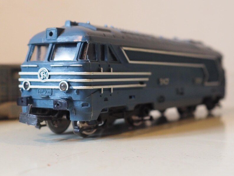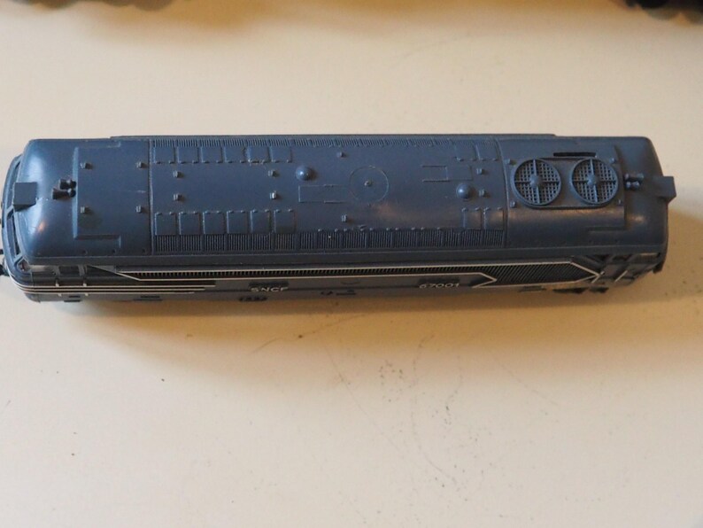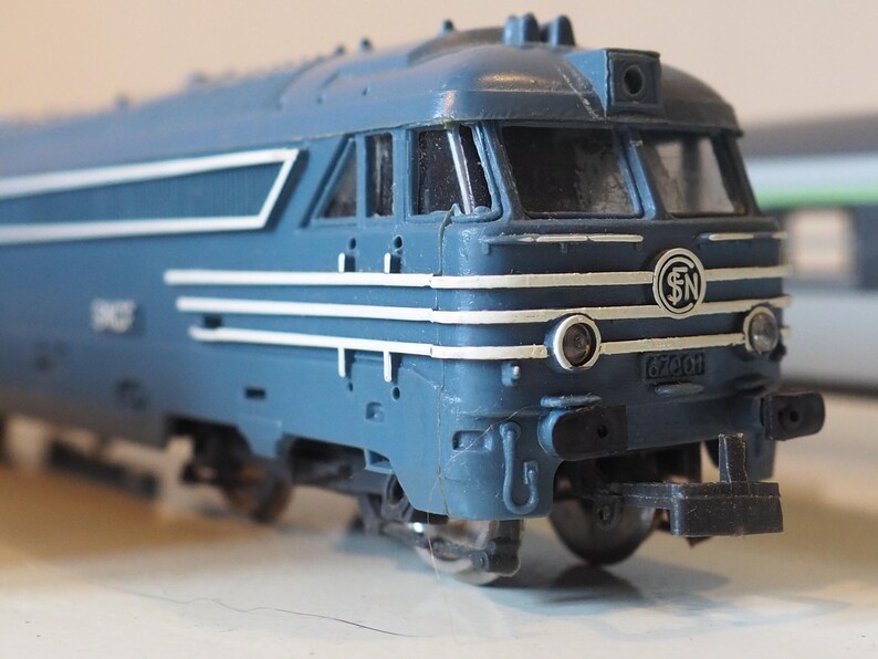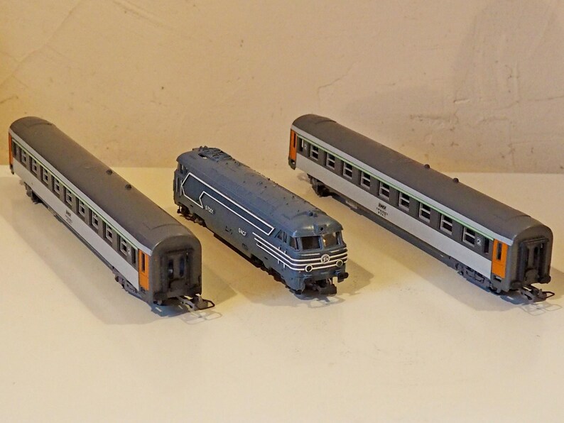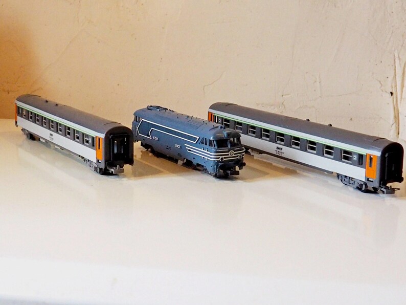 A fabulous vintage Jouef 12v electric HO gauge diesel locomotive SNCF number BB67001 in blue along with 2 passenger carriages sncf type Corail 5362 in orange white and grey