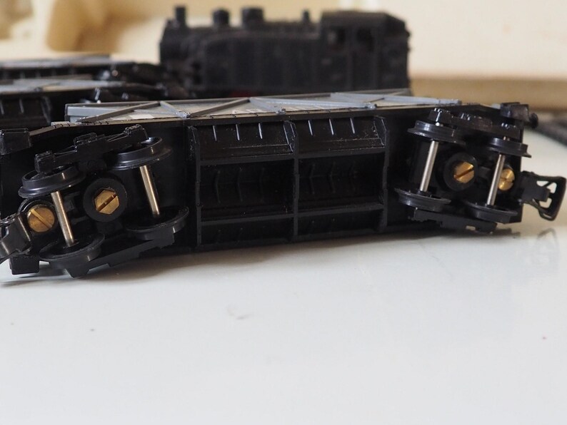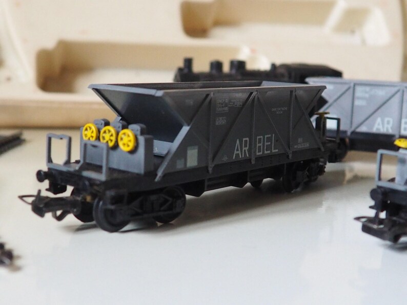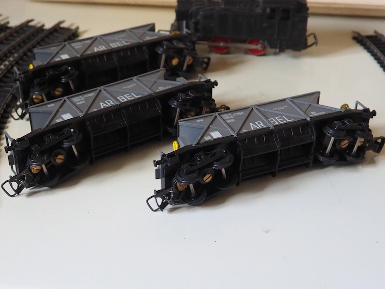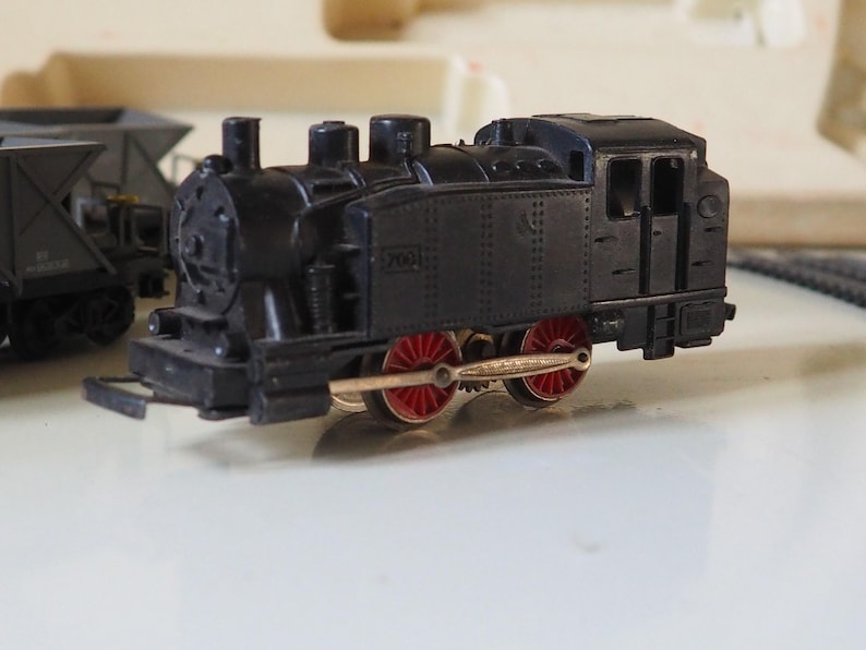 Included in the set is a locomotive in black and 3 carriages probably for coal or stone?and the 6 pieces of track, there is also some interesting sheets of paper with it that show the prices in those days and the different sets you could buy.